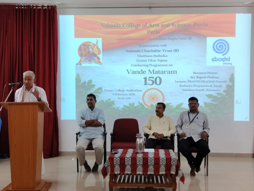 As part of the 150th anniversary of the song Vande Mataram, the “Vande Mataram 150” program was held in a grand manner. Organized with the objective of strengthening patriotic spirit, the event witnessed enthusiastic participation from dignitaries and students. The chief guest of the program, Rajesh Padmar, lecturer and Prant Prachar Pramukh of the Southern Region of the Rashtriya Swayamsevak Sangh, explained the historical significance of the song Vande Mataram. He said that during the freedom struggle, Vande Mataram served as a spark that ignited patriotism among freedom fighters. He movingly described how the song became a symbol of nationalism and guided people on the path of unity. Presiding over the function, Kajampady Subrahmanya Bhat said that Vande Mataram is not merely a song but the very soul of Indians. He expressed hope that such programs would help the younger generation understand the history and values of the nation. The welcome address was delivered by the Principal of Nalanda College, Shankara Khandige, who stated that the Vande Mataram 150 program is an important platform to nurture patriotism among students. The program was compered by Ashalatha, Head of the Department of Economics, who also delivered the vote of thanks. Among those present were Balakrishna Neerchalu, District Pramukh of Kasaragod of the Southern Region of the Rashtriya Swayamsevak Sangh and member of Manthana Badiyadka, members of the Nalanda College management, lecturers, and students. The program concluded with patriotic slogans and a collective rendition of the song Vande Mataram.